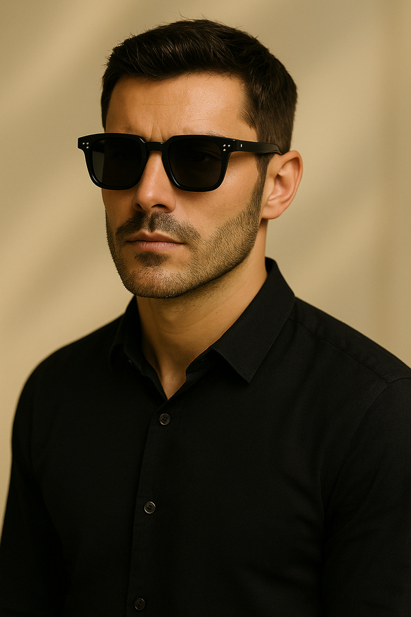 Modern eyewear designed for the confident urban man — bold lines, dark...